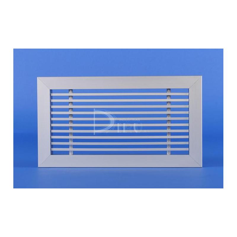 CARACTERISTICAS: Fabricada en perfil de aluminio extruido. Lamas fijas a 0º. El acabado estandar es anodizado en su color, bajo pedido puede suministrarse con diferentes acabados. Se instalan en techos, paredes, consolas y fan-coils, tanto para impulsión como para retorno de aire. Pueden llevar uno o dos tramos abatibles en sus extremos, siendo la longitud estándar de este de 150 mm., pudiendo ser variada bajo pedido. Se fabrican en longitudes máximas de 2 metros, aunque para longitudes mayores pueden ser ensambladas en varios módulos, dando la sensación de continuidad.
